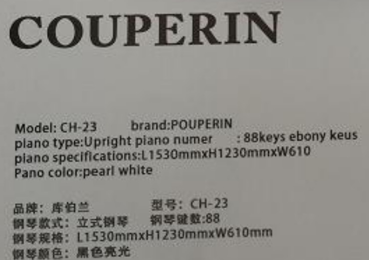 库伯兰立式钢琴,型号:CH-23,白色亮光,153*123*61,88键